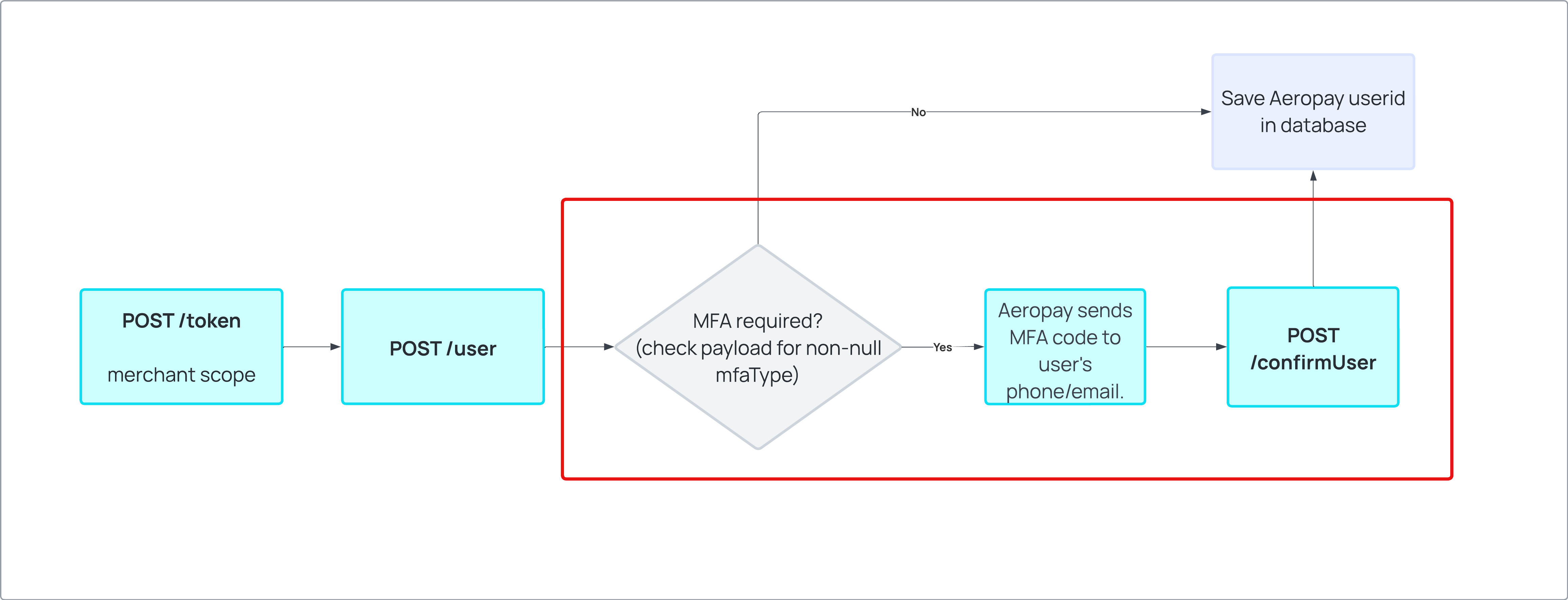New or existing Aeropay network users may be given an MFA challenge to their email or phone when POST /user is called.
